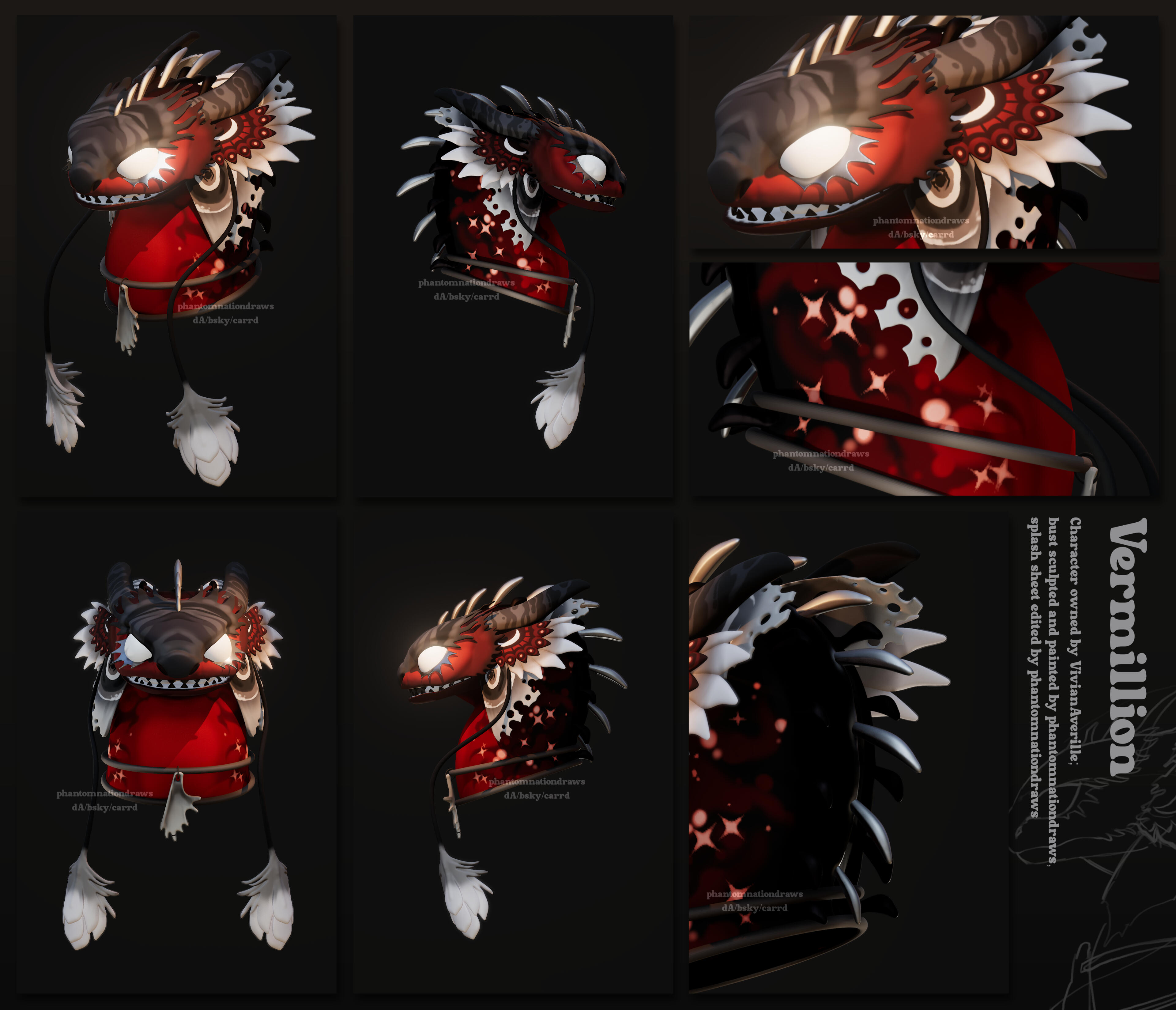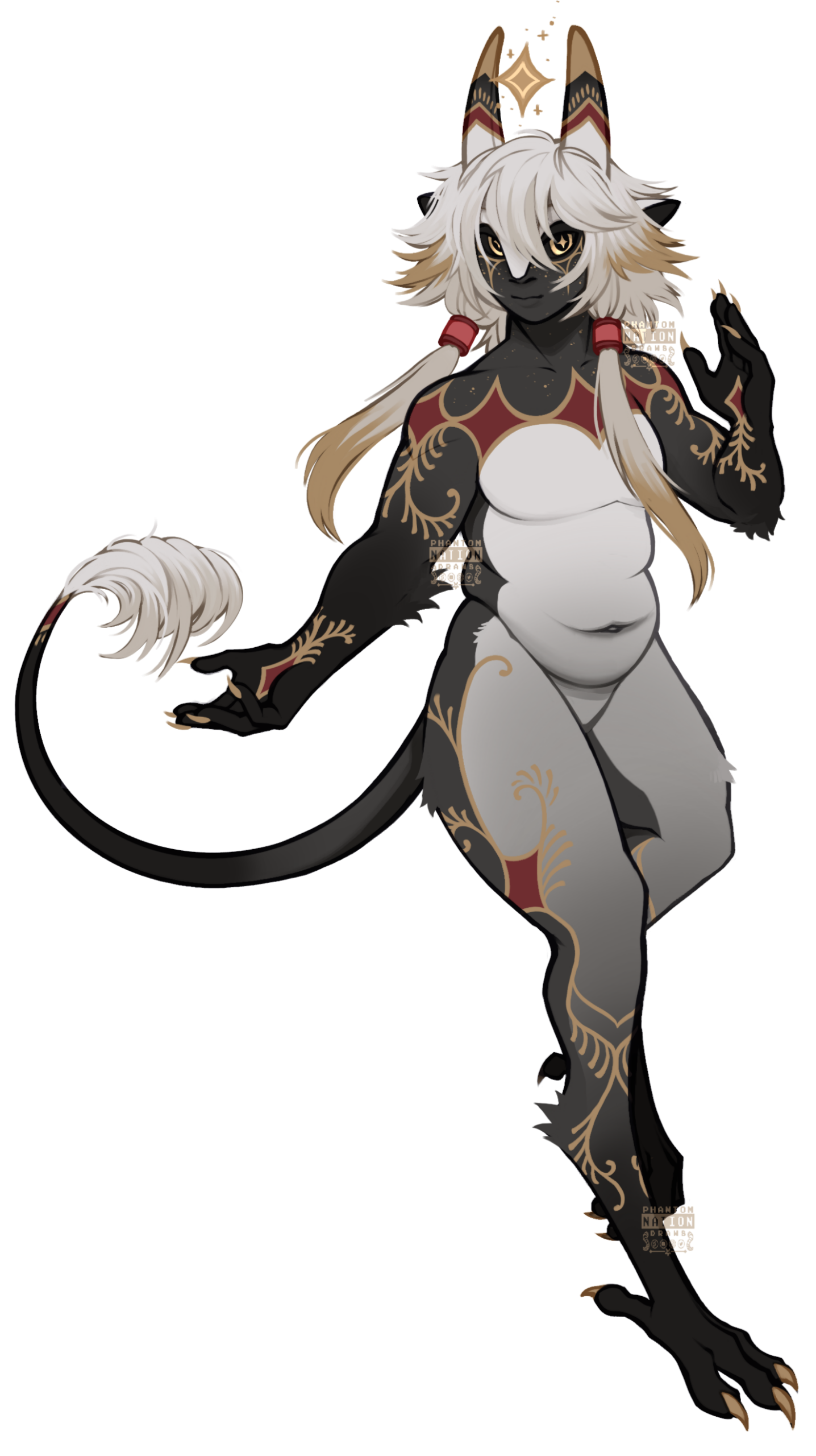 - Dark skin/white hair and black/white/gold, stained glass motif.